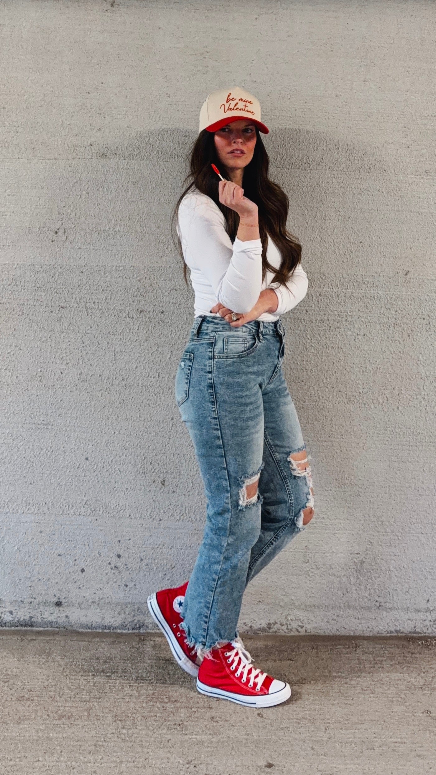 The Be Mine Valentine Hat is the perfect finishing touch for your everyday looks. Designed with a soft cream crown, bold red brim, and delicate red script embroidery that reads “be mine Valentine,” this hat blends nostalgic charm with modern boutique style.