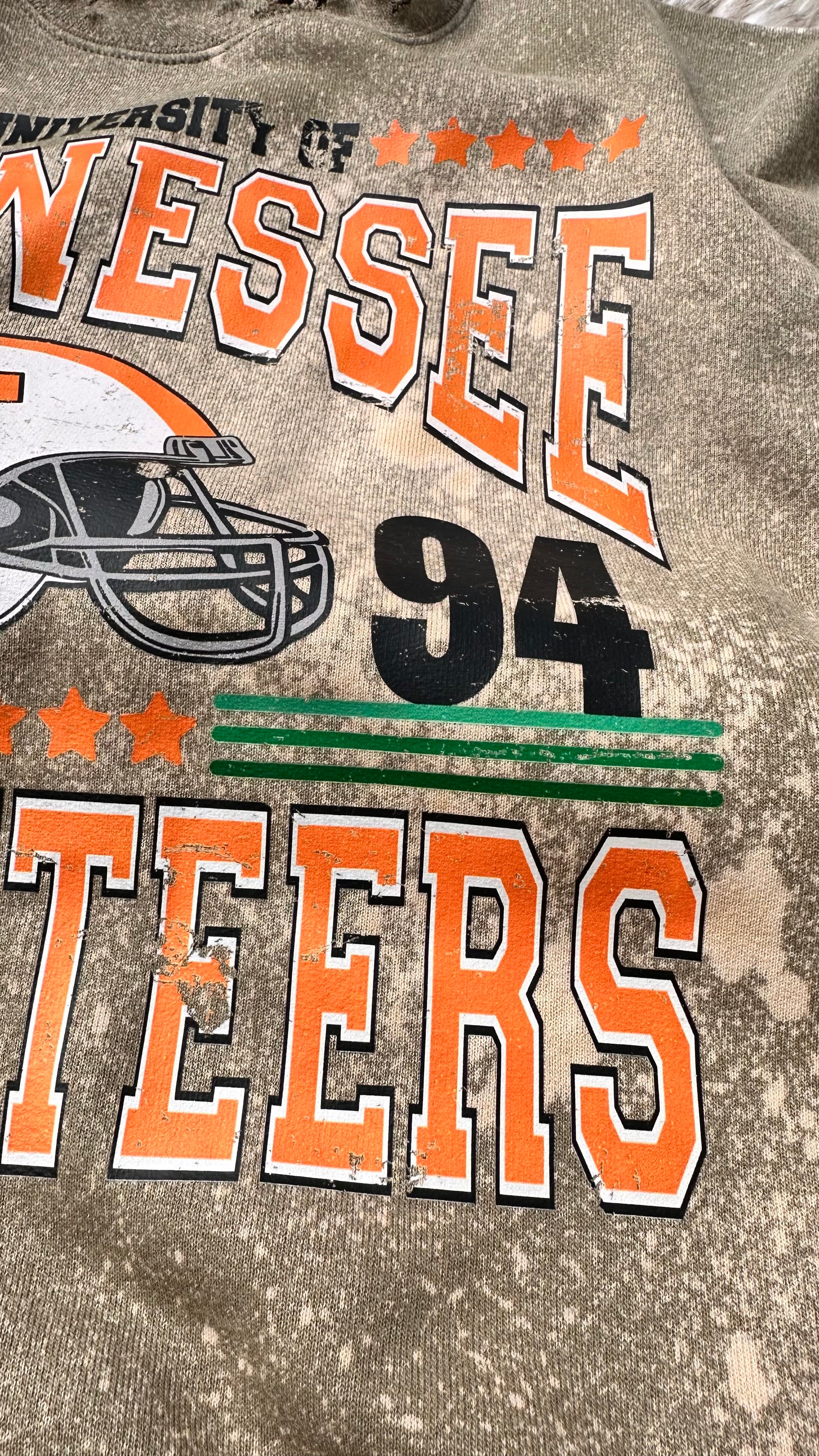 Bring vintage Vols pride to life with this distressed green Tennessee Sweatshirt. Featuring bold orange and white graphics with a classic football helmet and “1994” design, this piece is full of retro charm and team spirit. The soft green fabric has been uniquely bleached and distressed, creating a one-of-a-kind look with natural fraying and holes at the collar and hem for that authentic, lived-in vibe.