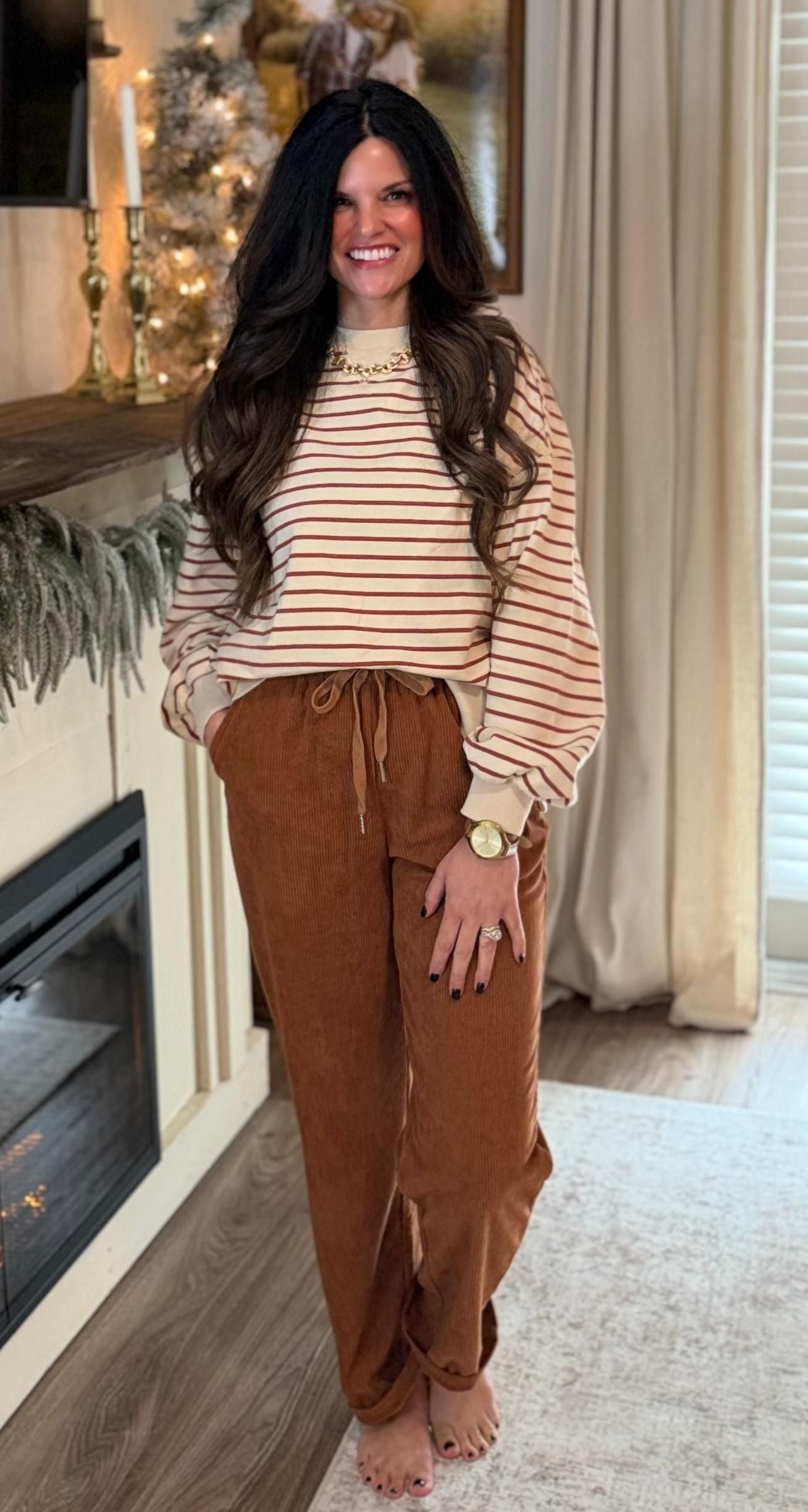 Our Rust & Cream Comfort Crew Neck is the perfect lightweight layer for cool mornings and sunny afternoons. Designed with a soft cream base and warm rust stripes, this crew neck delivers effortless comfort with a relaxed fit and subtle balloon sleeves for a polished, everyday look.