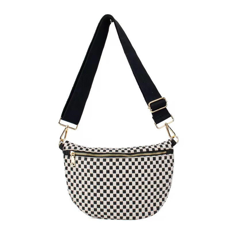 Featuring a bold black and white checker print with luxe gold hardware, this bag gives sporty meets chic energy. The wide adjustable strap keeps it comfortable for all-day wear, whether you’re running errands, headed to brunch, or walking into a Tennessee tailgate like you own the place.